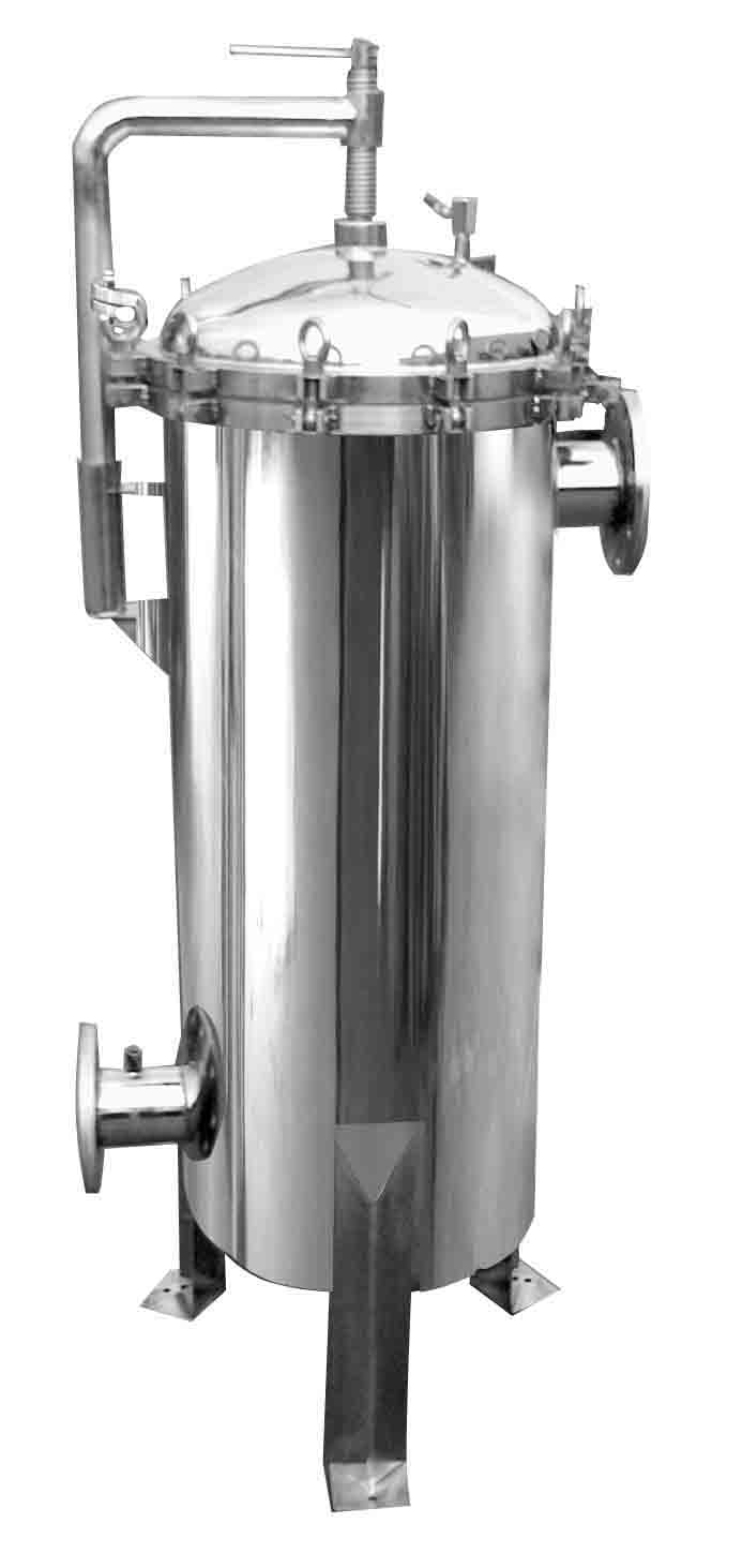 袋式過(guò)濾機(jī)是一種壓力式過(guò)濾裝置,主要有過(guò)濾筒體、過(guò)濾筒蓋和快開(kāi)機(jī)構(gòu)、不銹鋼濾袋加強(qiáng)網(wǎng)等主要部件組成,濾液由過(guò)濾機(jī)外殼的旁側(cè)入口管流入濾袋,濾袋本身是裝置在加強(qiáng)網(wǎng)籃內(nèi),液體滲透過(guò)所需要細(xì)度等級(jí)的濾袋即能獲得合格的濾液,雜質(zhì)顆粒被濾袋攔截。該機(jī)更換濾袋十分方便,過(guò)濾基本無(wú)物料消耗。